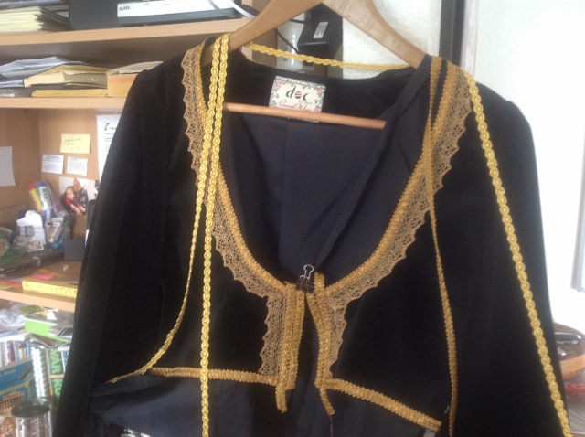 Kreta har många olika dräkter men den här fångade Pias intresse. Den består av vita byxor, vit överkjol, förkläde fram med broderier och frans, förkläde på baksidan, en blus med spetsar och brodyr samt en jacka med guldband och broderier.